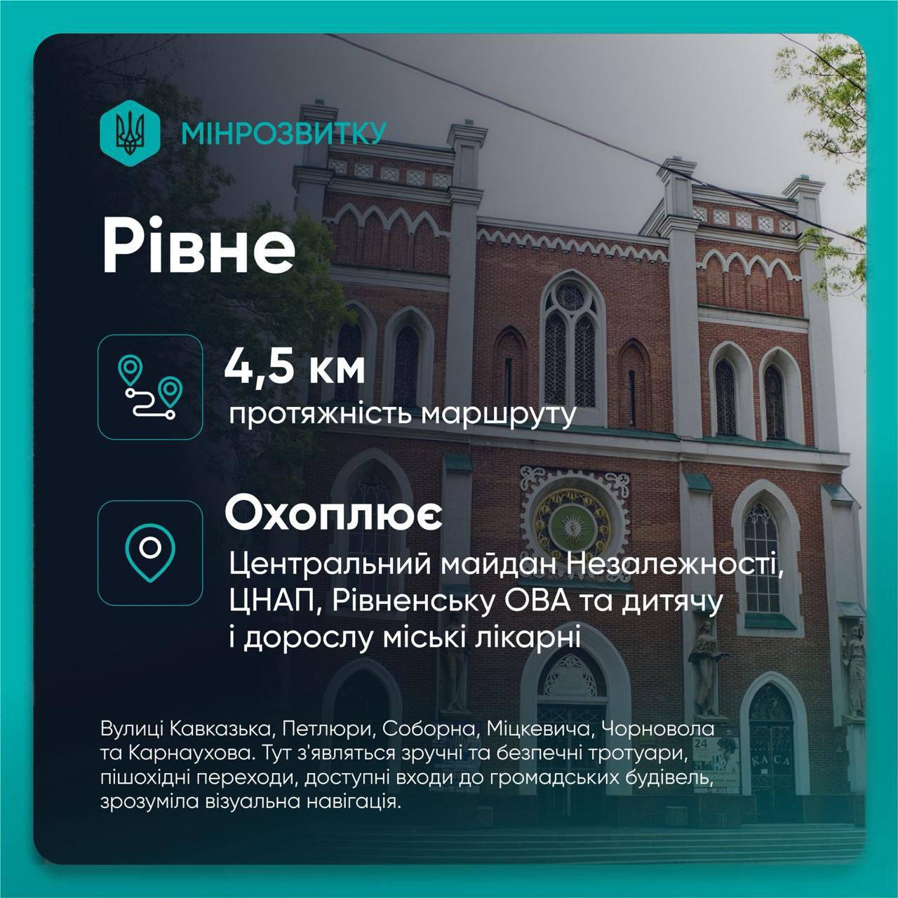 «Маршрут охоплює середмістя Рівного, сполучивши ЦНАП, 3 лікарні, Центр реабілітації людей з інвалідністю «Крок» та чимало інших соціально важливих об’єктів. Загальна протяжність – 4,5 кілометри. Наразі триває спорудження першої черги на вулиці Петлюри. Зокрема, облаштування переходу біля Центру зайнятості», – зазначив Олександр Коваль.