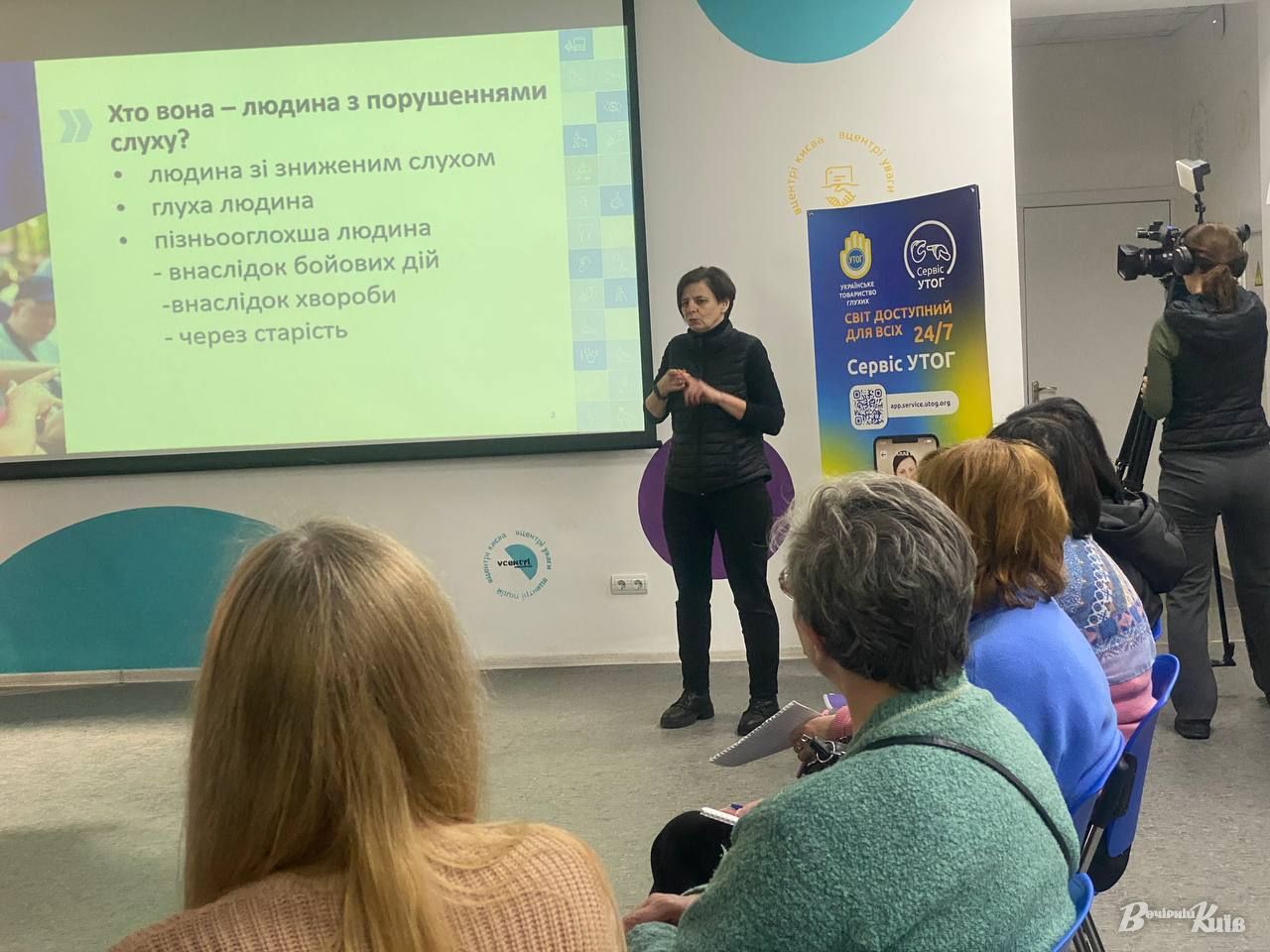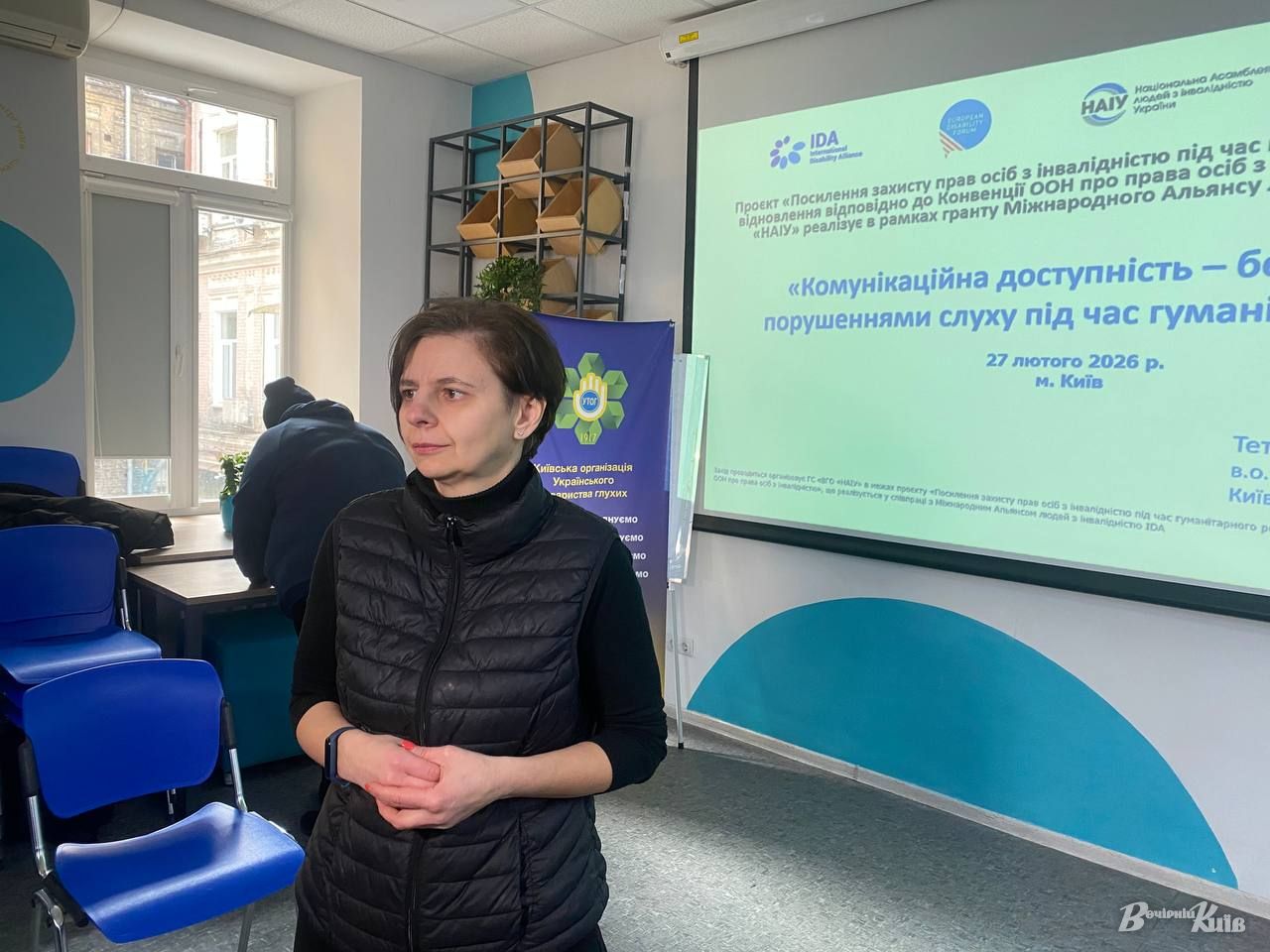 В.о. голови Київської організації УТОГ Тетяна Корнієнко озвучила ключові проблеми, з якими стикаються люди з порушеннями слуху під час війни, шляхи їх вирішення, а також представила результати опитування серед цієї групи населення.