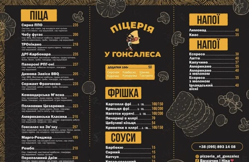 “Піци у нас незвичайні, і є одна фірмова – “Гонсалес на зв’язку”. Для військових є спеціальний куточок, куди вони приносять свої шеврончики, прапори. Зал просторий, на 24 місця, тож заходьте та смакуйте”, – запрошує Валерій Кучеренко.