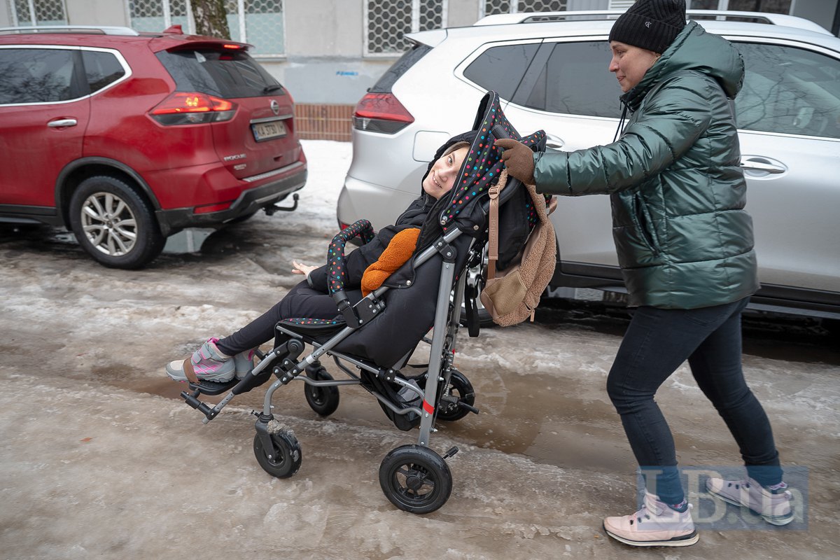 Колеса візка на дорозі ковзають, застрягають у вибоїнах. Держава забезпечила родину стандартним візком. Галина зітхає, що Полі потрібен індивідуальний — через сколіоз і особливості спини: «Такі виготовляють за кордоном, вони дуже дорогі».